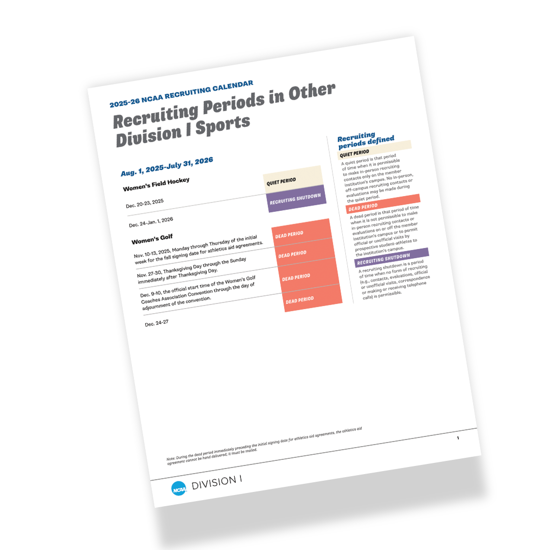 A sport-specific recruiting calendar that shows exactly when Division I coaches are allowed to contact, evaluate, and recruit student-athletes during the 2025–26 year. This is an essential planning tool to understand quiet periods, contact periods, evaluation windows, and dead periods—so families know when communication is allowed and what to expect throughout the year.